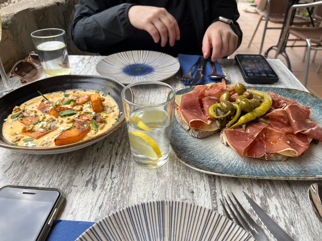 When we finally got to Deià we dropped by Cafe Deià for some cava and charcuterie and a creamy beetroot plate. I was flattered that our server understood my Spanish!