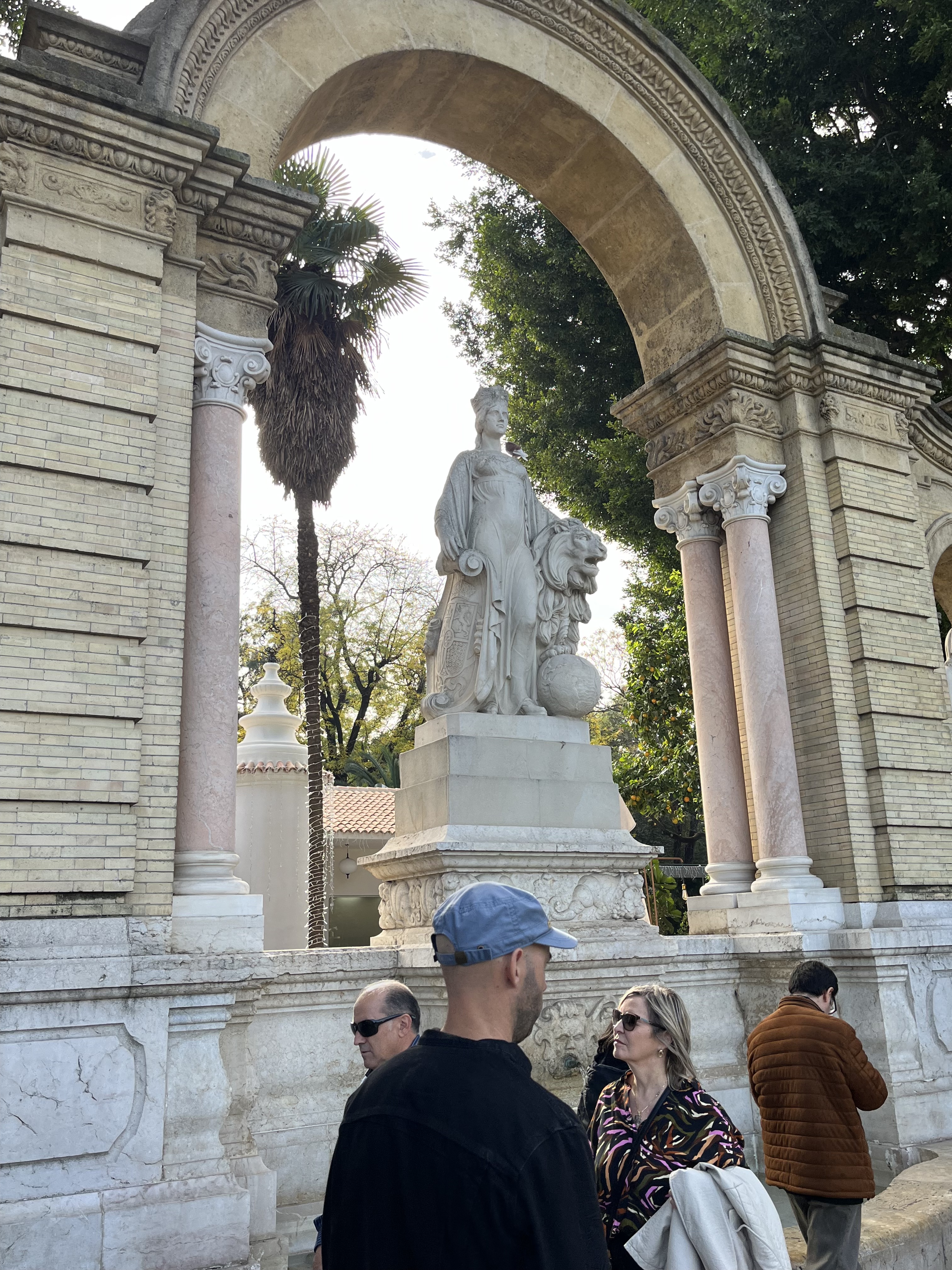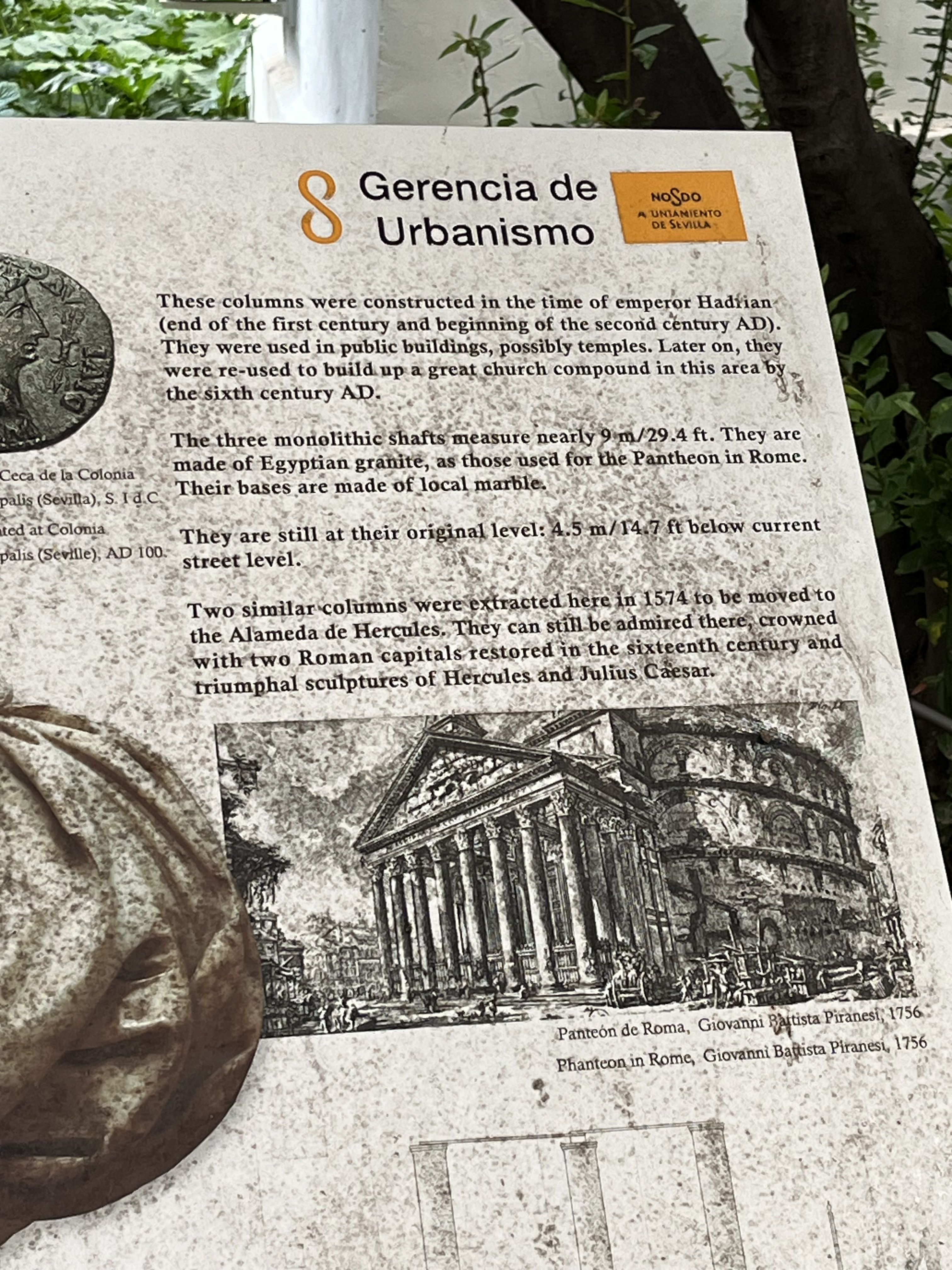 Some background on Sevilla: According to our guide, Sevilla is the oldest city in Europe, although other cities undoubtedly claim that distinction. It was originally a trading spot for the Phoenicians beginning 2,500 years ago. They discovered gold and silver nearby and thus began Sevilla’s good fortunes. The city lies on the Gaudalquiver River close to the Atlantic, making it the biggest inland port in Spain. The Romans arrived under Julius Caesar, who established Sevilla as an important outpost. Caesar built a wall around the city, little of which now remains. After the fall of the Western Roman Empire in the 5th century, the area was conquered by the Visigoths, who eventually succumbed to the Moors, who invaded from Morocco and took over around 712 AD. There are extensive Roman ruins nearby in Italica, which I would visit if I had a car. There are two columns remaining in the center that were built during Hadrian’s reign at the end of the first century AD. Hadrian and Trajan were two Roman emperors who were born in the region.