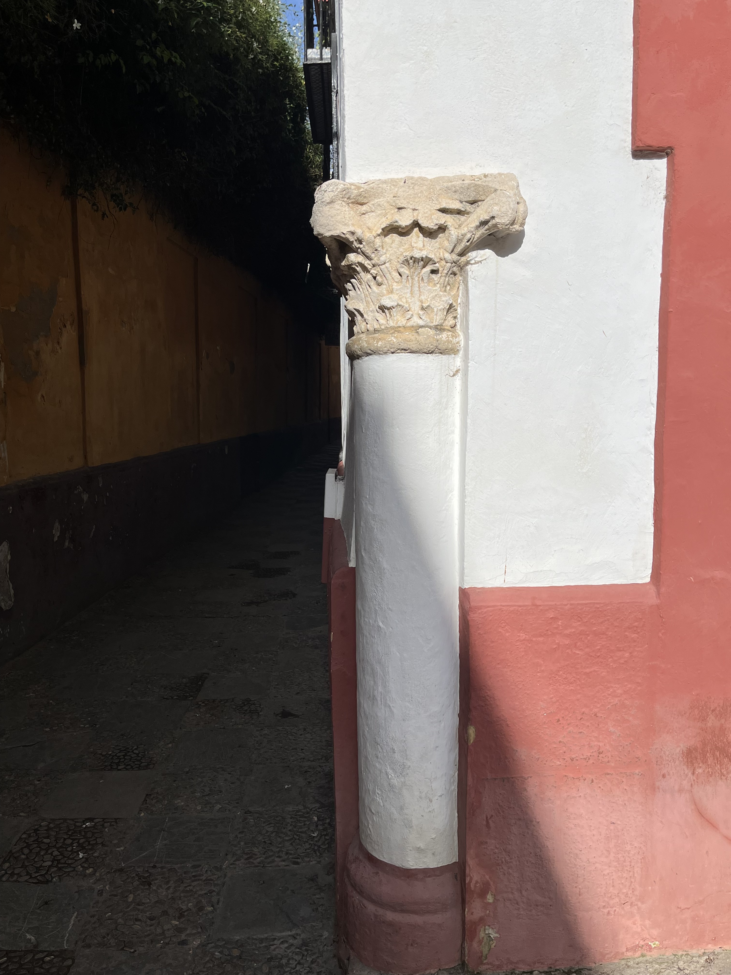 As in many ancient cities, successive conquerors reused the Roman temples and buildings to construct their own monumental buildings, including the Moors, who were renowned builders and architects and whose legacy is found everywhere on the Iberian Peninsula. For example, first mosques, and then cathedrals, reused granite and marble from Roman ruins to build the bases of their buildings. Roman columns were widely used on street corners to prevent horse-drawn carriages from smashing corner houses. Below are examples of the foundations, corner protectors and part of the remaining Roman walls.