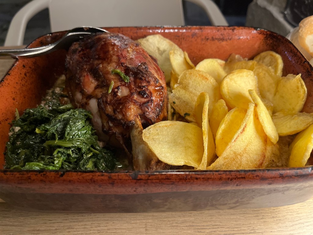 I ordered the roasted pork shank with a glass of 2019 Tons Duorum and a side of sparkling Pedras water, the go-to in Portugal. The serving was enormous, but I got through half of it and all of the spinach.