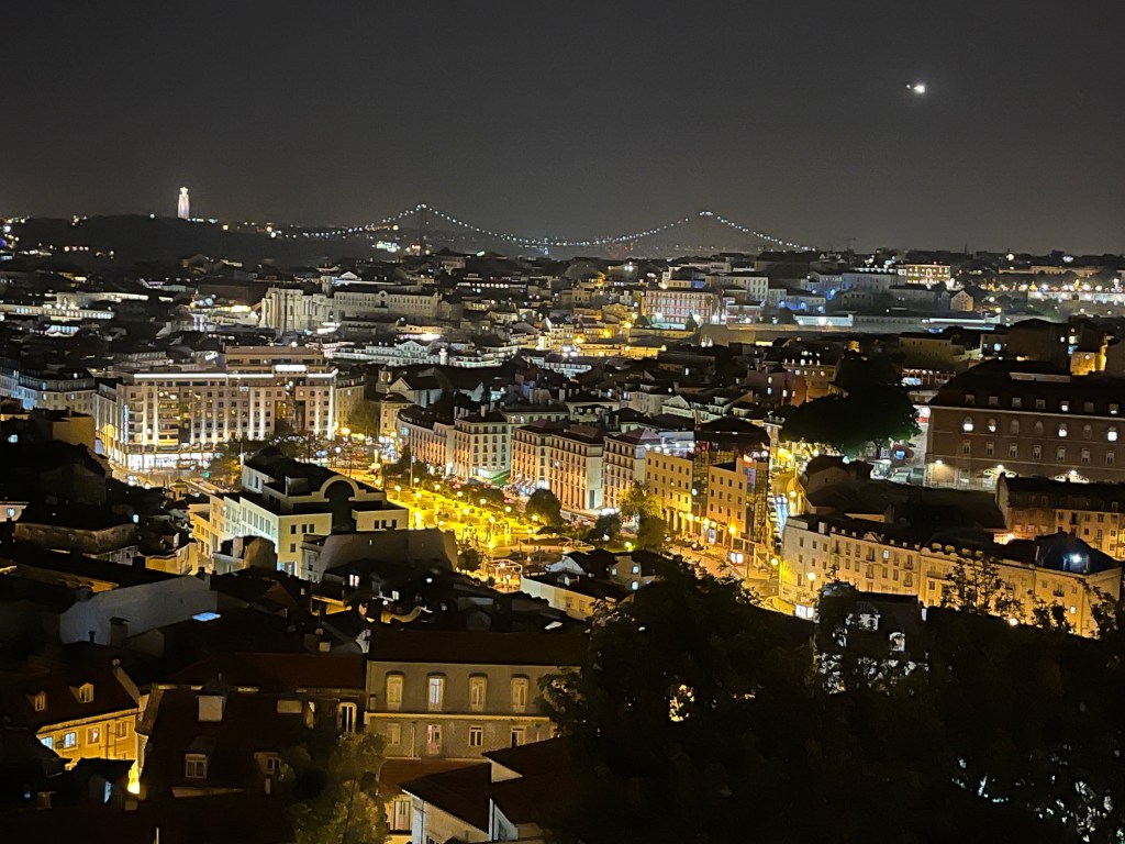 Had a relaxing morning at the hotel and checked out before heading over to the new digs in Graça, on the heights to the east. At the hotel bar, the server comped me a cappuccino and a small pastel de nata. This morning was the Lisbon Marathon, so I knew the ride over to the other side of the city center might be longer than normal, but the Uber driver took back streets and got me there before my host, Maria, arrived. Maria owns a number of high-end Airbnbs, and since we got to know each other when I rented her Chiado place, she gave me a cash discount to rent the new one privately. The place is huge and has three bedrooms. It’s just below the city’s most renowned vista point, or miradouro. I just took some night shots from the living room.