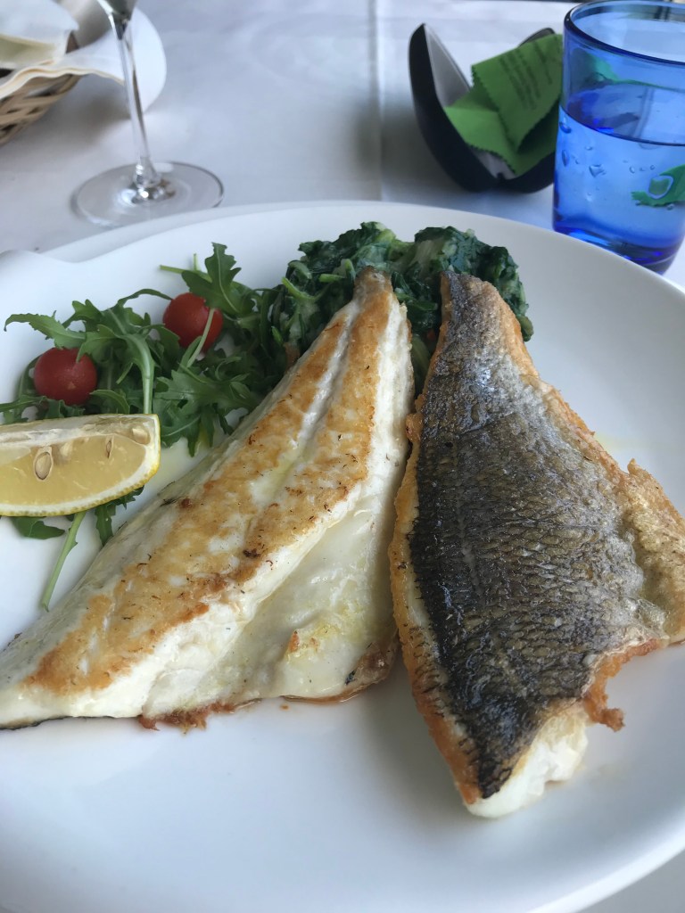 I was drenched with sweat given the heat and humidity and went through four bottles of water along the way. After walking about 3 miles, I stopped at a fancy beachside restaurant for an excellent lunch of freshly caught sea bass and the usual Croatian vegetable dish, washed down with a nice Croatian Pinot Gris. The shade felt great and the mountains and the scenery along the broad sweep of the Adriatic reminded me of Santa Barbara.