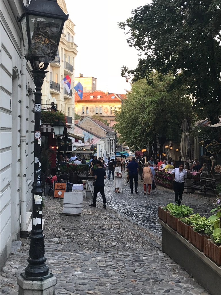 After I collected my bag at Belgrade’s Nikola Tesla Airport, I walked outside and hailed a cab to my destination, what turned out to be a superb Airbnb close to the center, on Marŝala Birjuzova, named in honor of a Soviet general who led the “liberation” of Serbia. I’d texted with my hosts in Sarajevo and they had the place ready for an early check-in. After putting things away, I headed out to grab dinner in the hip Skadarlija district. After reconnoitering the neighborhood in the heart of the Old Town, I sat outside to a wine bar, Vinoteka Skadarlija, and sampled some Serbian wines and appetizers. I was a bit tired, so I walked back to my flat through some busy neighborhoods and retired around 9.