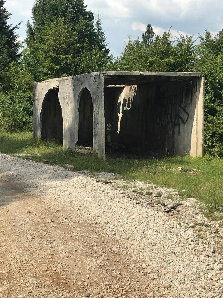 After breakfast the next day, I had the driver take me down to the old Olympic Village where I was scheduled to rent a mountain bike from a fellow named Thierry, who had been referred by Katja, the manager of the bike shop in Ljubljana. Thierry was a nice guy, a Dutchman who had married a Bosnian before the war and decided to stay. The bike was a new Santa Cruz with a new preprogrammed Garmin Edge 1030, which runs around USD 599. He gave me a quick overview of the Garmin and the route, which would take me around the airport, through some countryside and the Bosniak village of Hrasnica, and then up a gravel road to the ski resort on top of Mount Inman. I had barely gotten past the airport when another epic downpour hit. The temperature dropped by about 20 degrees and I found shelter under a bus stop. The rain lasted for about an hour and I was freezing and soaked. I had to relieve myself so badly that I simply stood in the rain and went in my Lycra shorts. That was a first! When the rain let up, I headed towards the mountain. The sun came out and it got much warmer. As I pedaled up the mountain, 1,510 meters high, I passed an odd factory as well as a pulverized bunker. I wasn’t able to see the French Army APC that had been hit by Serb artillery and rolled down a deep ravine, but a sign marked the spot. The views from the summit were stunning-a lush green panorama. The descent was fun and I got back to the airport area pretty much on time. I did pause to see the famous airport tunnel that was used to ferry in arms and supplies during the siege.