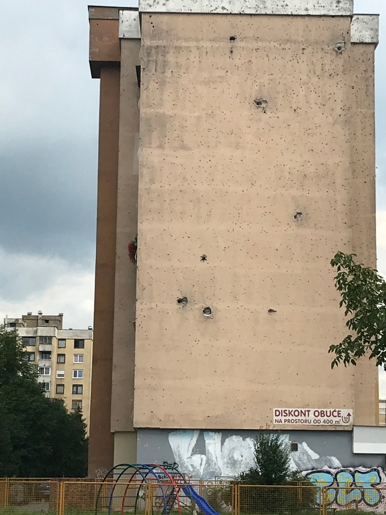 The gravel road I was biking on was the only way into the city for a few years. I passed some Communist-era housing blocks with walls pitted and cratered from heavy-caliber machine fun and mortar fire. I also was almost hit by a city bus on the shoulderless road. When I got back, still pretty muddy, Thierry and his assistant invited me to wash up and then he graciously gave me a ride back to the hotel. I told him about the vegan restaurant incident and he just laughed, saying that I would have been fine. He has Bosniak and Serb women working for him and they got along fine.