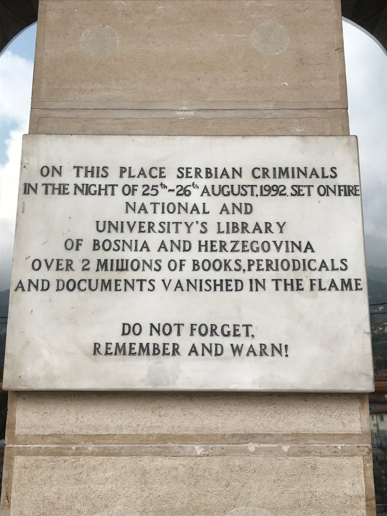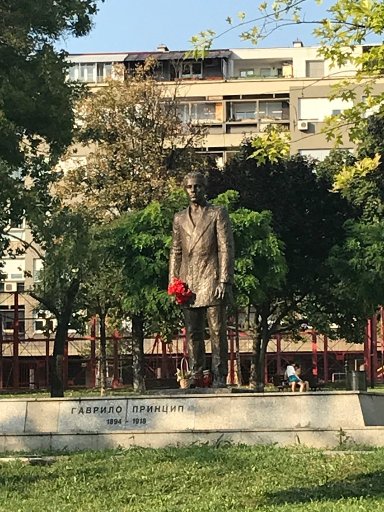 As we were leaving the government complex, we stopped at the Ministry of Defense complex to see the ruins of the 1996 NATO airstrikes. The Serbs have left the ruins intact. Across the street were the ruins of the television station, where a few employees died in the airstrikes. Heading downhill towards the river, Jovanka pointed out a statue of a young man bedecked with flowers. She asked me if I knew who it was and I shouted “Gavrilo Princip!” She was a bit shocked that an American would know that. The plaque in Sarajevo wasn’t covered with anything but anti-Serb graffiti.