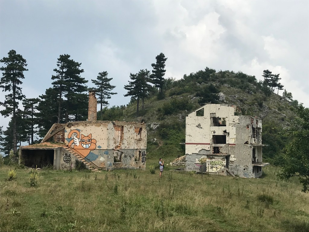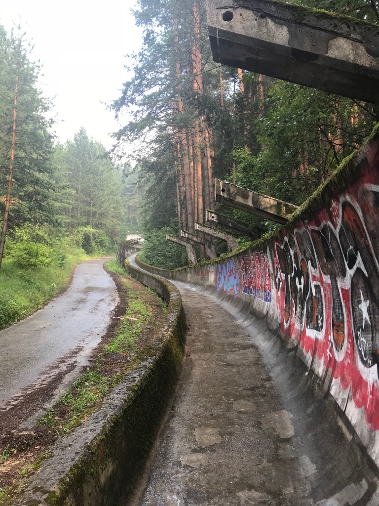 The next morning, after an ample breakfast served in the hotel dining room, I decided to walk up a long path to Mount Trebević, one of the abandoned sites from the 1984 Sarajevo Winter Olympics. As I got closer to the abandoned luge run I passed a number of buildings partly leveled by the Serb bombardment during the siege. The Serbs held all of the high points around the city except for Mt. Igman and fired at will. As I approached the bottom of the concrete luge run, a huge thunderstorm erupted and I grabbed refuge under an abandoned bridge, where several other storm refugees had gathered, including a young Danish couple and another couple from Argentina. We spent the next hour discussing our travels. The Argentines were traveling around the world for a year. After the storm abated, we parted and I walked up to the peak along the graffiti-covered luge run. At the top I hopped on the cable car for a panoramic descent into the valley and the city center. The cable car, or Žiĉara, was destroyed during the siege and rebuilt in 2018.