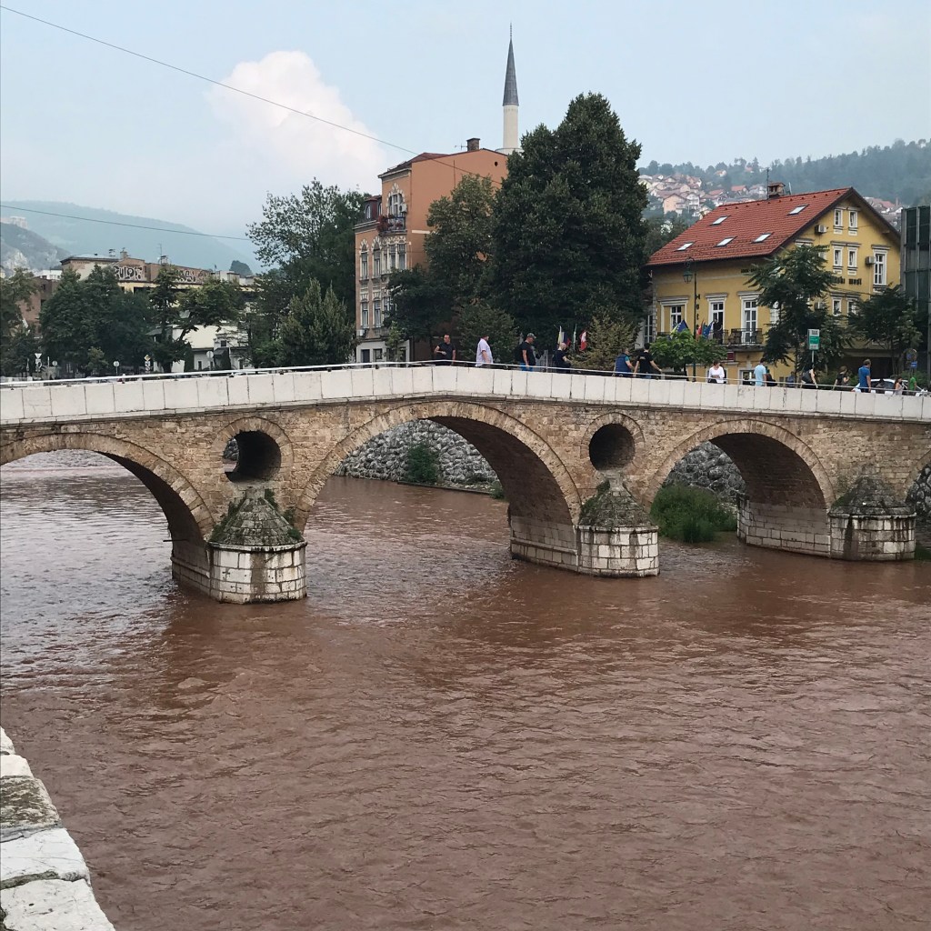 The hotel was on a bluff above the main city and a circuitous path led down to the center, past neighborhood mosques with Ottoman-style minarets and the Sarajevo Brewery (Sarajevska Pivara) built in 1864. From the brewery I walked down to the Miljacka River and crossed the Latin Bridge, where Archduke Franz Ferdinand and his wife Sophie were assassinated by Gavrilo Princip on June 28, 1914, precipitating World War I. I walked through a throng of locals and tourists in the bazaar, noticing a fair number of head coverings on the women. There was a major restoration project on some of the Ottoman buildings and mosques, all prominently noted as being financed by Turkey. I decided to look for a nicer restaurant than those on offer in the bazaar and made my way down the river embankment to the Nova Bentbaša. Once seated, I encountered a drunk Australian couple. The woman loudly asked “are you American”. To which I answered “yes”. She then staggered over to my table and stated that she normally despised Americans. Fortunately, the maître d’ walked over and escorted her out. After a nice Bosnian meal overlooking the river, I called for a taxi and returned to the hotel.