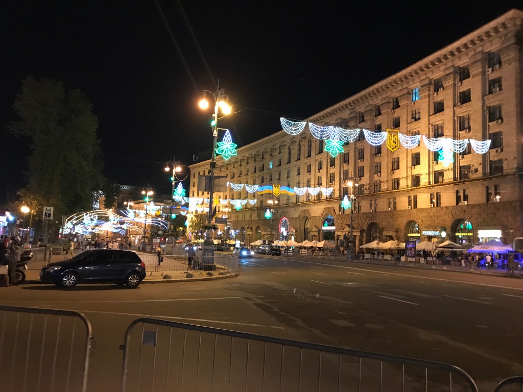 The drive west from the main airport was on an eight-lane freeway that passed some large residential towers under construction and then crossed the wide Dnipro River into the city center. The hotel was tucked into a small alley behind the main boulevard, Khreshchatyk Street, and just a short stroll from the famous Maidan Nezalezhnosti (Freedom Square), the site of the bloody 2004 and 2014 color revolutions. The reception folks at the Crystal Hotel were lovely and my room was well-appointed and very quiet.