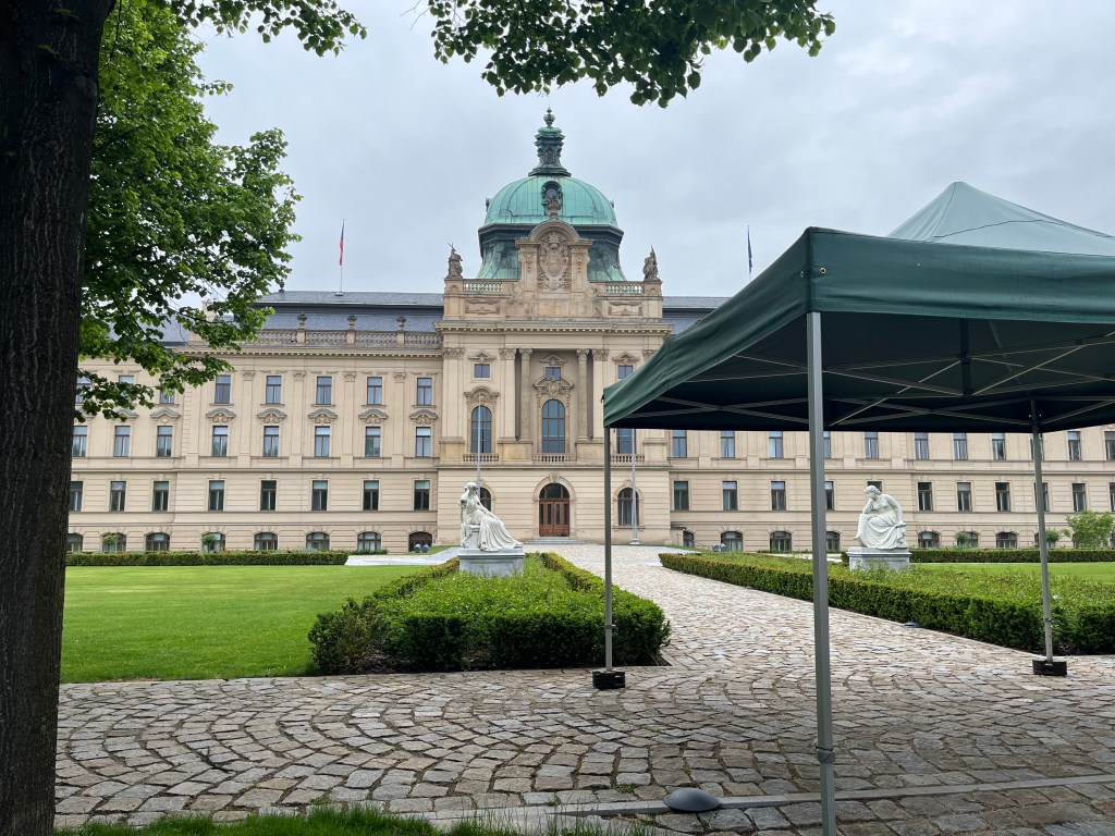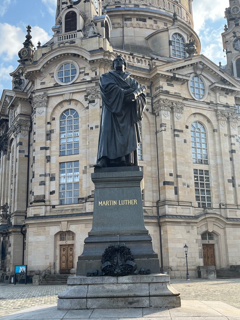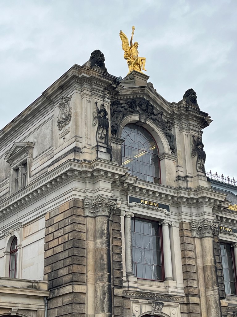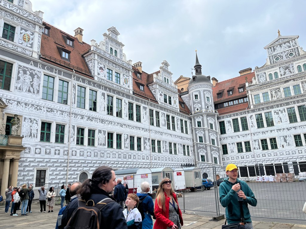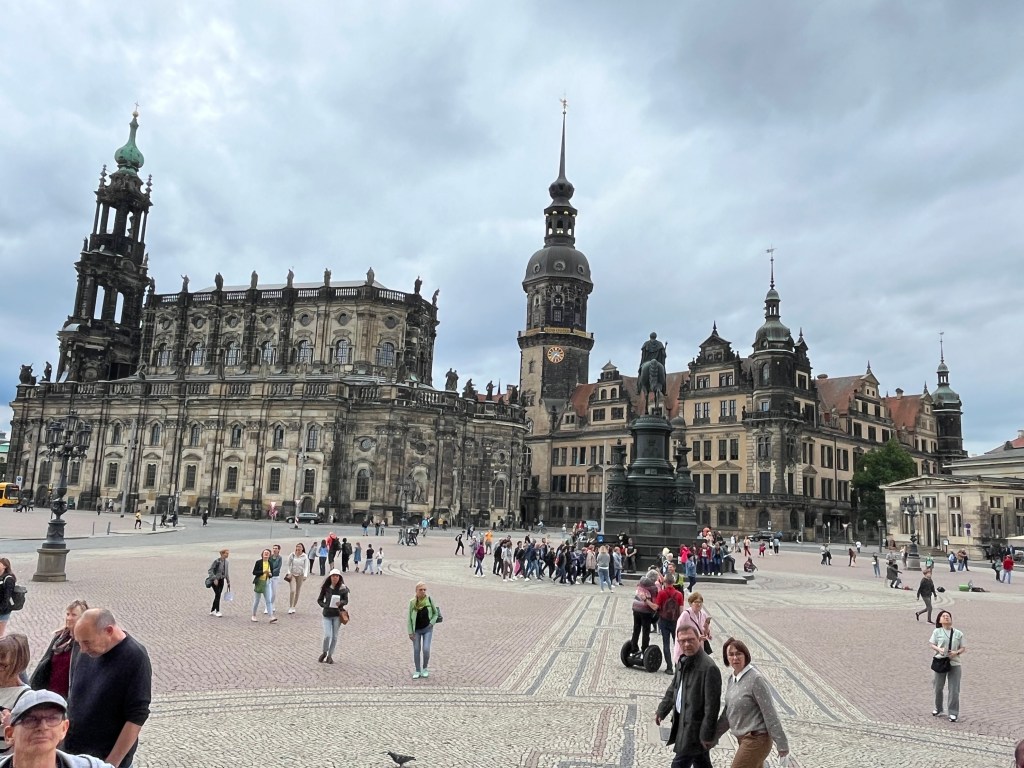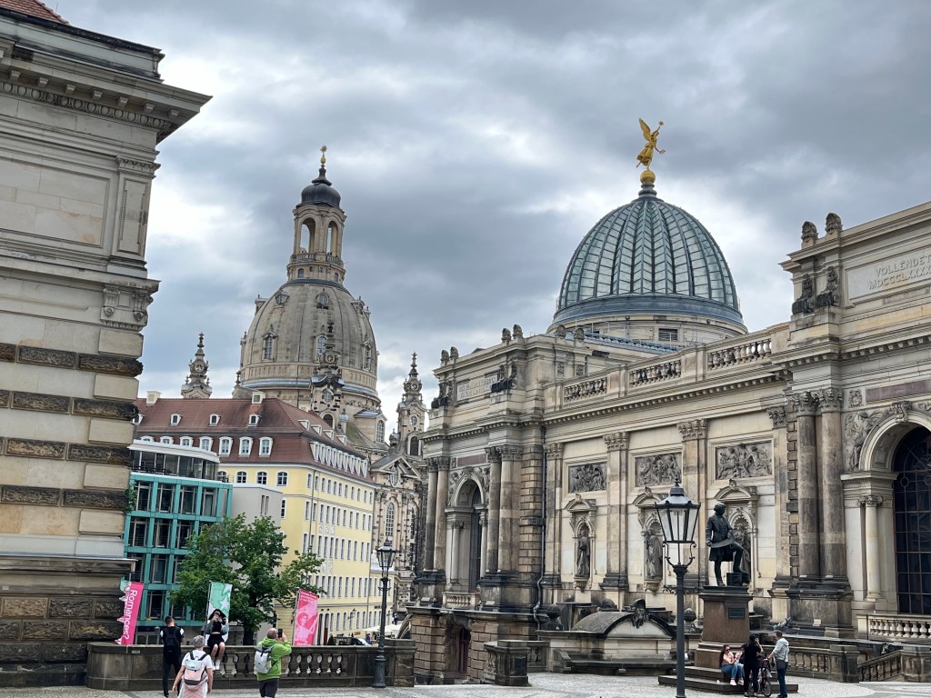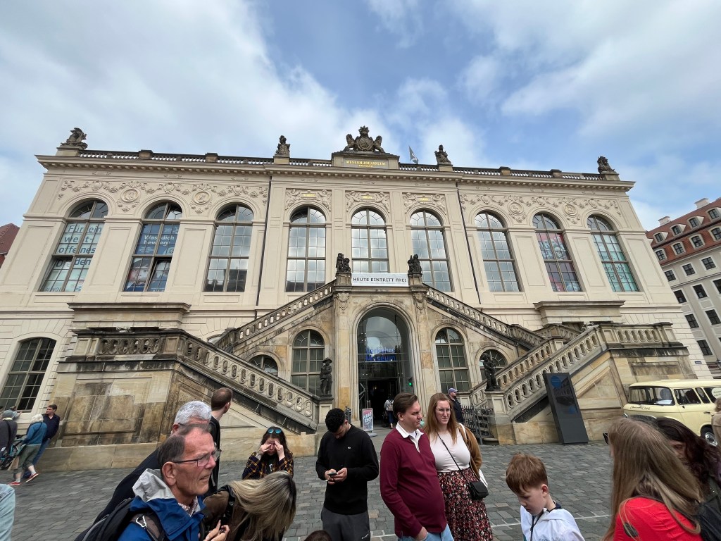 During the stop at the Kulturpalast, James presented an overview of the Bombing of Dresden in early February 1945. I gave the number of 150,000 dead in my previous post, a number I recalled from reading Kurt Vonnegut’s Slaughterhouse Five, based on his experience of living through the bombing as an American POW. The official number, drawn from burial registrations, is 25,000, still a significant death toll. Especially since 2000, the government and private sources have meticulously rebuilt the historic center, which is ongoing. A first time visitor would never know that the Altstadt had been obliterated and rebuilt.