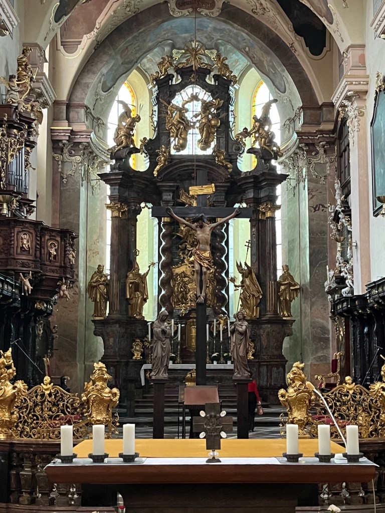 From Nový Svêt, I made my way back up the hill towards the Hrad to revisit Loreta and the famous Strahov Monastery, founded by an austere order in 1140 and rebuilt in the Gothic and Baroque styles later. It’s still a functioning monastery. When I walked inside, a priest was lighting the Pascal candle.