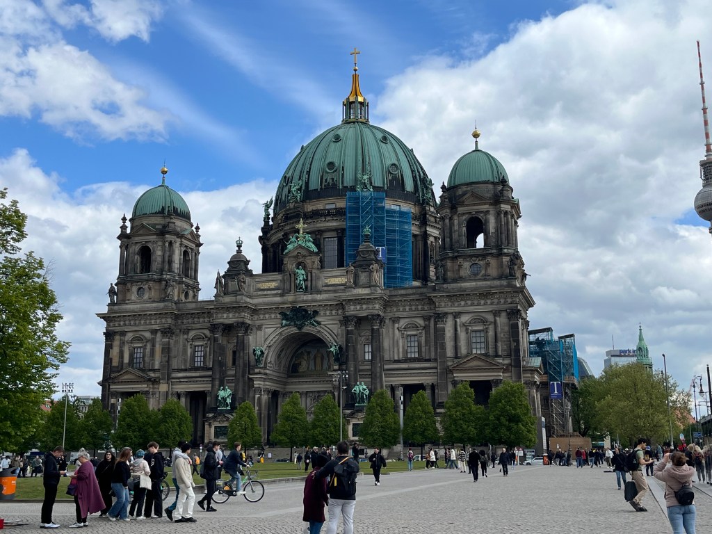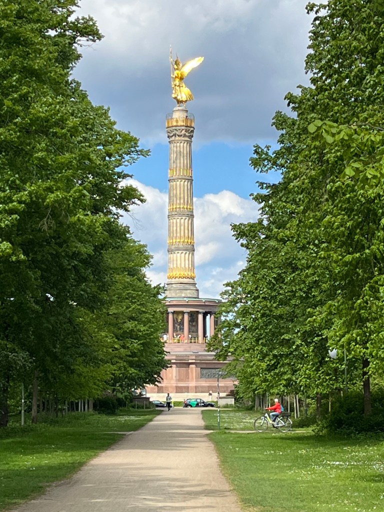 Notably, Berlin is a very green city. About 2 km in, I was in the vast Tiergarten, where I caught some glimpses of the Victory Column. Later, Anton, our bike tour guide, informed us that the original column was near the Reichstag, but Hitler moved it farther away to be a focal point on the new East-West Axis, which his court architect, Albert Speer, designed. He also built four buildings with tunnels to go under the boulevard to get to the column. Our guide pointed to the many bullet holes left over from the street fighting during the Battle of Berlin in April 1945 as the Soviet forces fought their way into central Berlin.