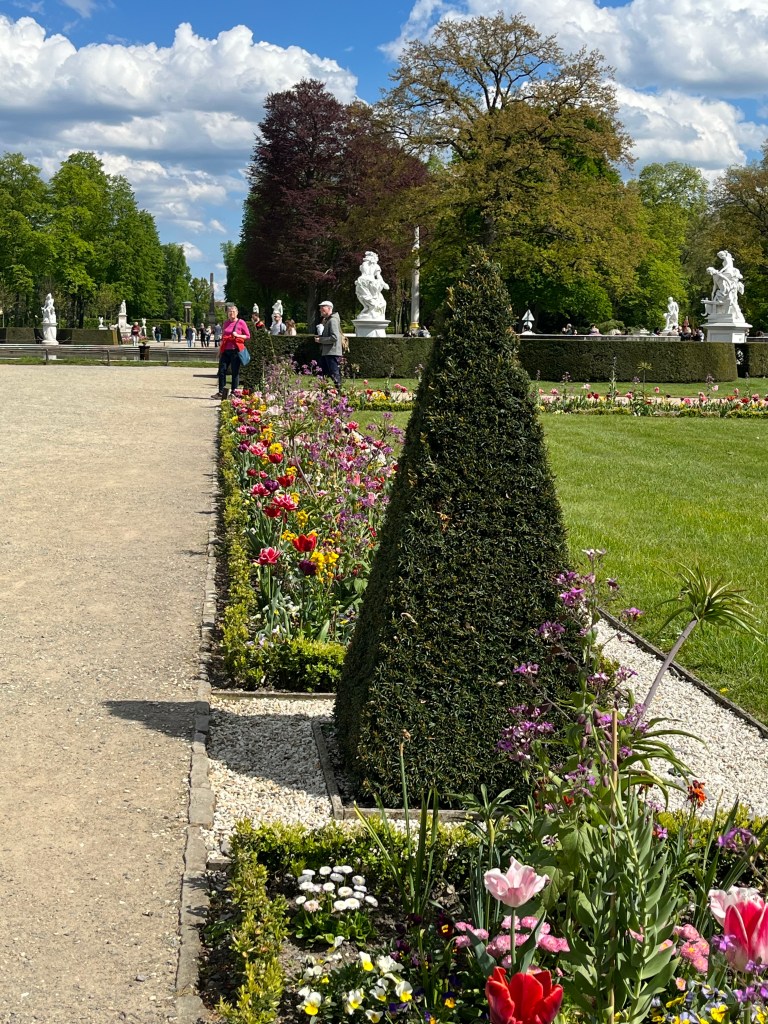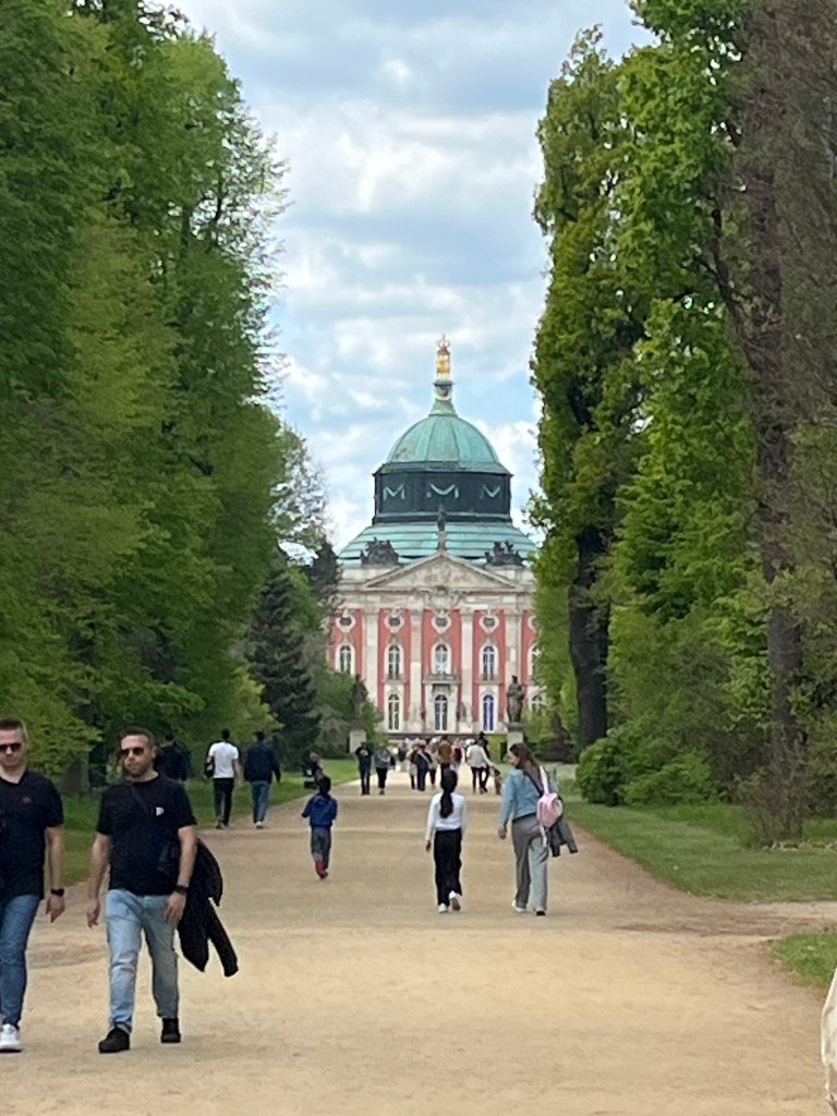 Looking toward the Roman Baths from the rear plaza After spending about thirty minutes enjoying the palace grounds, I walked down a hundred steps to the broad pathway leading to the Luisenplatz, where visitors were enjoying the spring afternoon eating al fresco. From there I grabbed a tram back to the Potsdam Hbf and was lucky to jump on the S-1 back to Schöneberg just as it arrived.