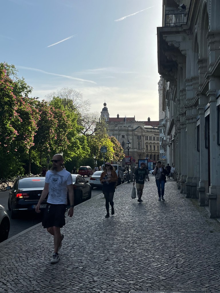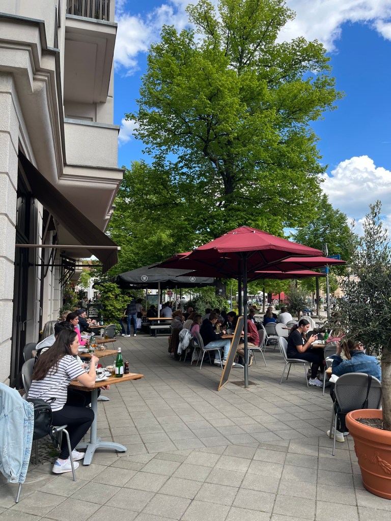 Last night I slept until about 4:45 am. After a few minutes, though, I fell back to sleep and arose around 7, feeling well rested. My lower back was sore from the bed, so I sat in a chair and put my hands on the floor while stretching for a minute, which felt great. With no coffeemaker, I walked down the Martin-Luther Strasse a few hundred meters and had, in succession, a cappuccino and a flat white, the price for both less than for one latte in Nashville. The morning is sunny and finally warming up, reaching about 60 today and hitting the 70s by Sunday.
