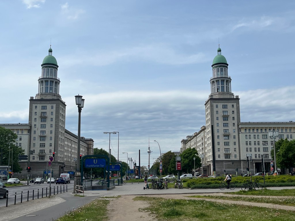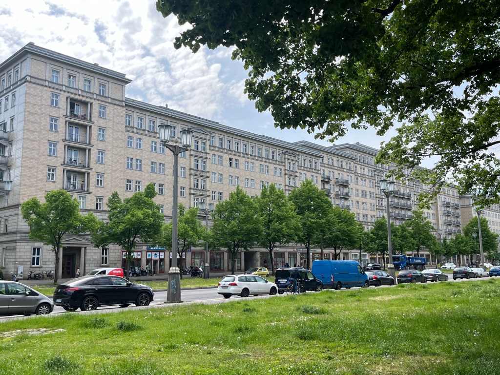 Kosmos cinema The next stop was the Karl-Marx-Allee, also lined with Stalinist and “catch-up” Modernist apartment blocks. Before reunification, there was no tree-lined median strip since it was used for massive May Day and military parades during the Communist-era. Further on, one arrives at another “gate” pair of Stalinist buildings at the Strausberger Platz.
