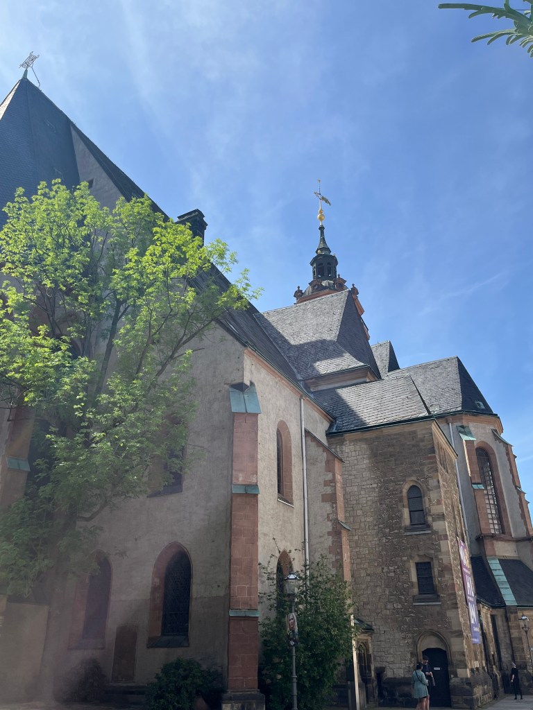 Once I got back to the center, I entered historic St Thomaskirche, founded by the Augustinians in the 13th c. It went through several renovations before becoming a Lutheran church in the early 16th c. Lutheran churches in Northern Europe would be considered “high church” in the US since they still retain a Catholic “light” liturgy and crucifixes. In the Church of Sweden, they still use incense. The organist was playing Bach during my brief visit. Bach is buried under the nave.