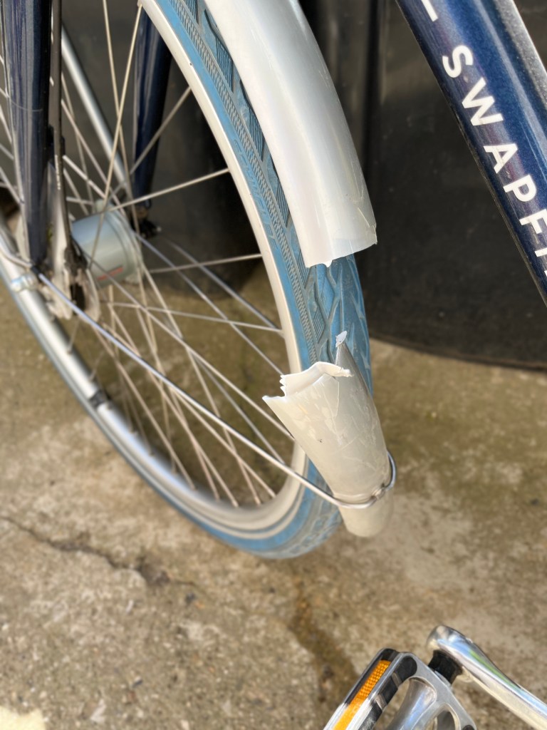 Well, my legendary good luck has not been with me this week! On Monday morning, I decided to use the nice hotel fitness center for a workout. I usually do at least 3 sets of 12 pull-ups per week. The gym had one of those gnarly machines with 4 angled pull-up bars instead of the traditional straight ones that I’ve been using for years. When I hopped up to grab the bar, I felt a stab of pain on the inside of my right arm, around the area of the lower bicep and forearm. I then iced it on and off for the next 24 hours until it was feeling better. Worried that I may have torn something I called my son, who’s in an orthopedic practice. I’ll see him when I’m back next Thursday . Well, about 3 miles into my ride a thick twig flew into the front wheel and I went down, involuntarily breaking the fall with my right arm! Ouch! I wasn’t going fast, but this set my recovery back. The twig broke the front plastic fender and bent a spoke. I thought it smart to return. The owner and his girlfriend came over and told me not to worry about the bike. After icing it again and taking 650 mg of Bayer aspirin, it’s feeling better. I’ll stick to walking from now on!
