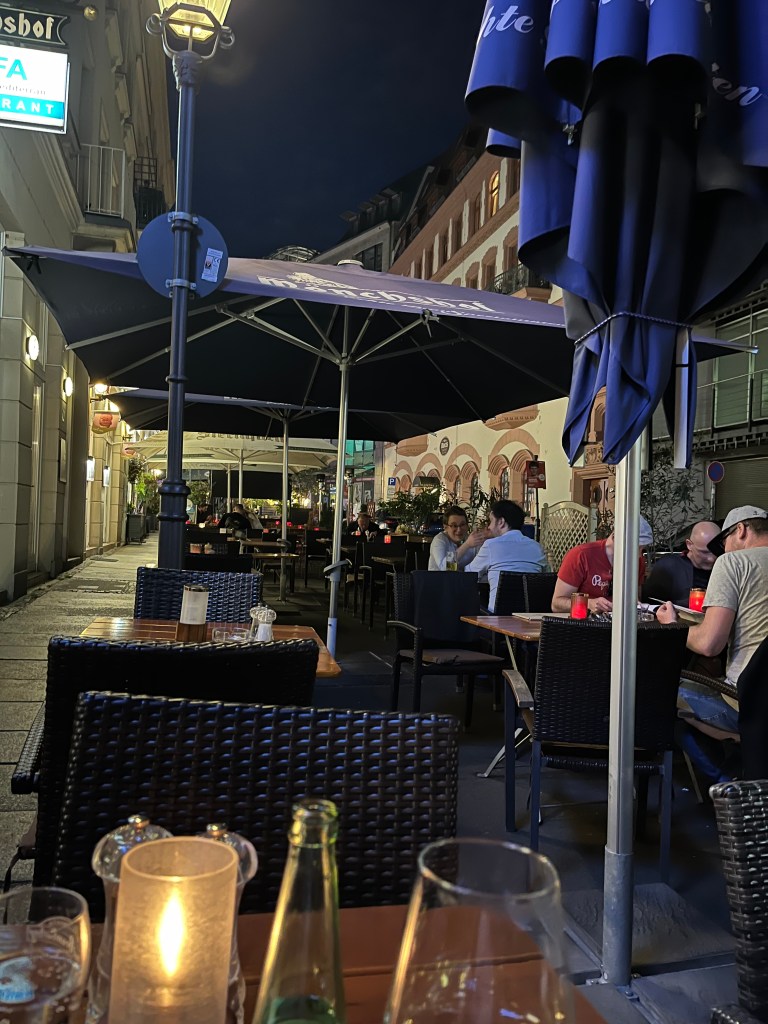 On the way back to my place, I snapped a few pictures of the streetscape. It was twilight and there was a rock concert in the park adjoining Martin Luther Ring, which circles the central core. In Germany it’s common for people to walk around with beer bottles in hand and the police presence is minimal. Unlike the US, I’ve never seen bottles broken on the streets the next morning. It’s a very different urban experience, as travelers to Europe are aware.